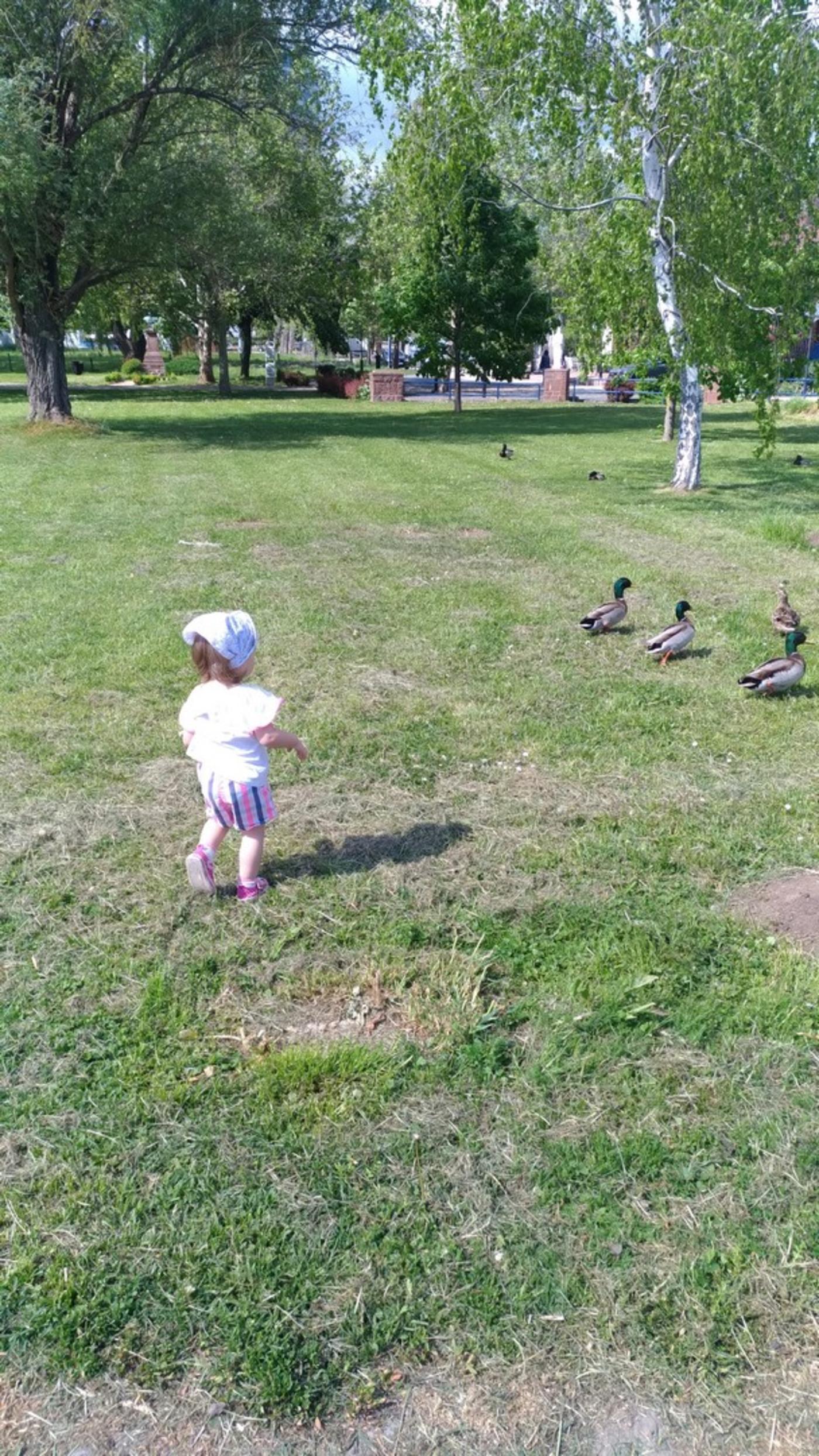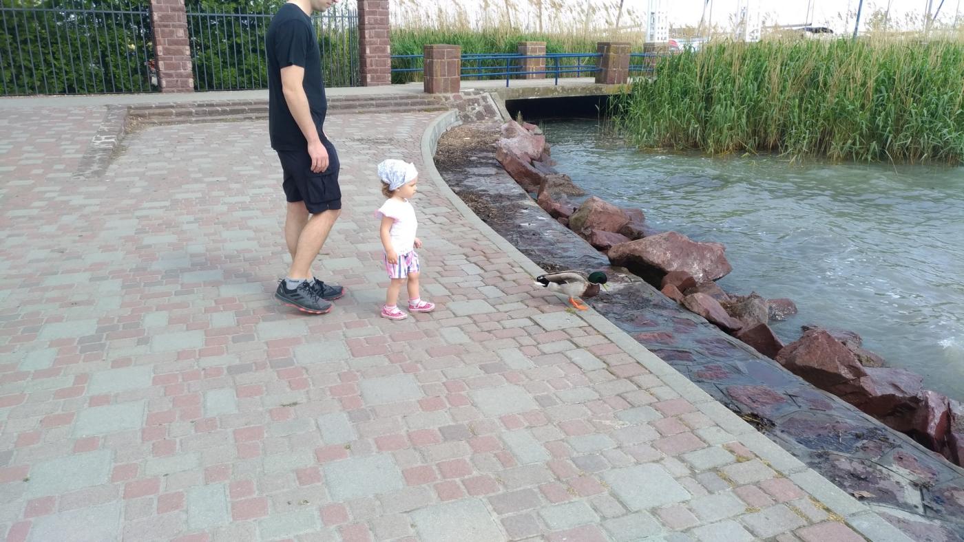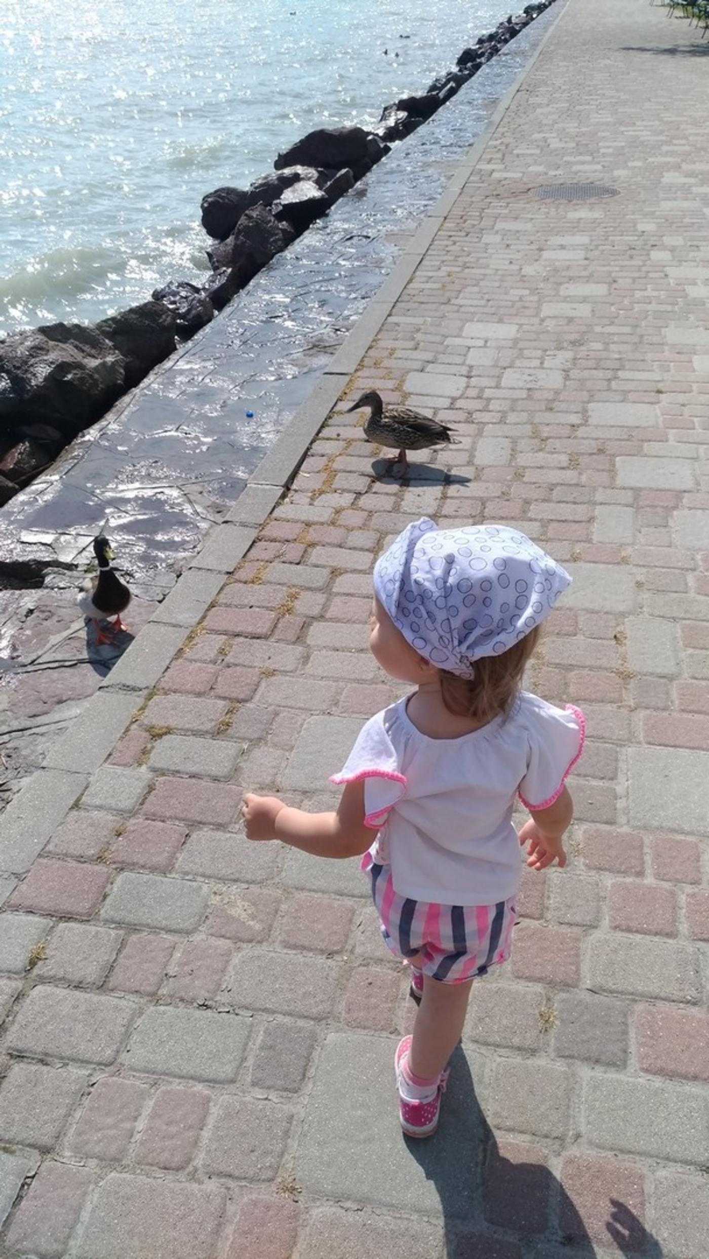 Szukając jakichś atrakcji niedaleko nas trafiłem na kilka ciekawych miejsc. Pierwszym z nich był port i park w pobliskiej miejscowości Balatonalmádi. Weszliśmy tam na molo, a następnie przeszliśmy przez piękny park, w którym gęsto było od platanów. Kini sprawiły radość kaczki, za którymi biegała i próbowała łapać.