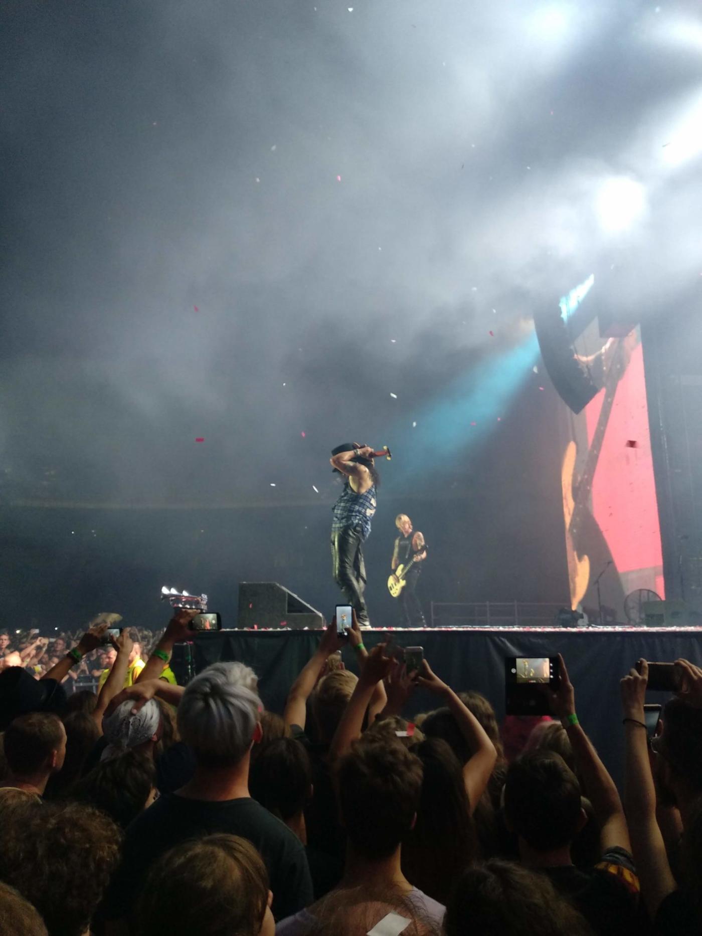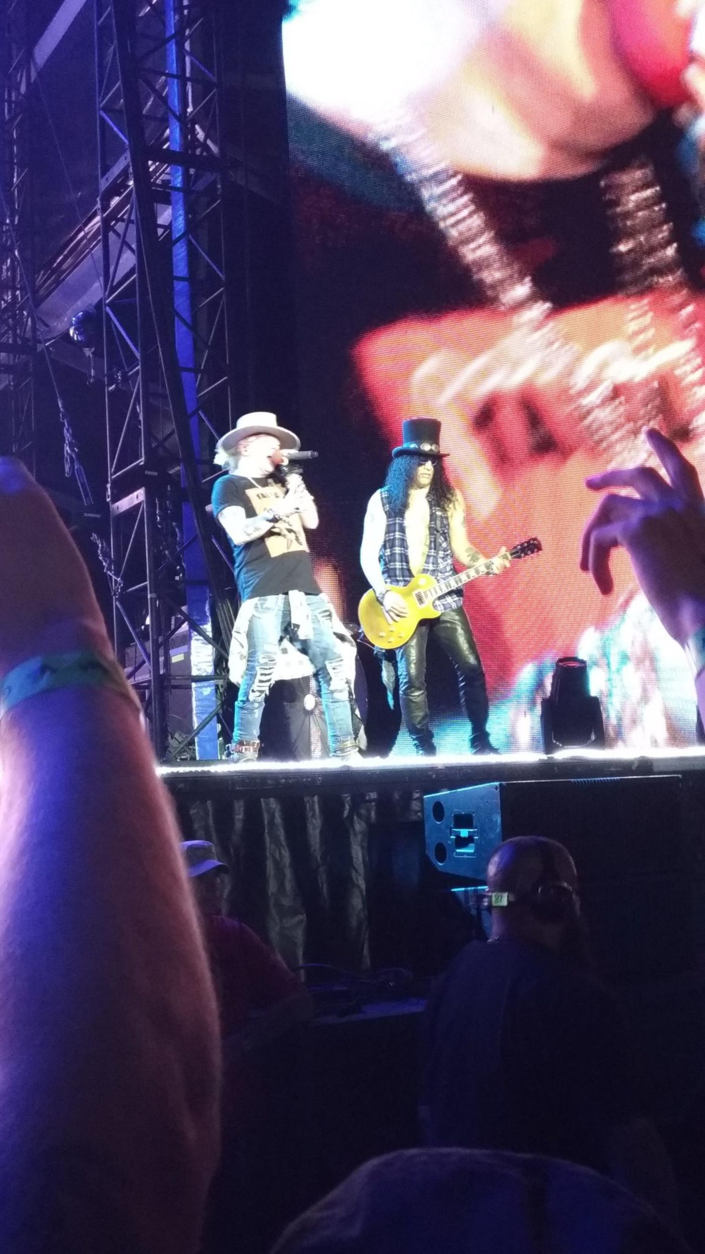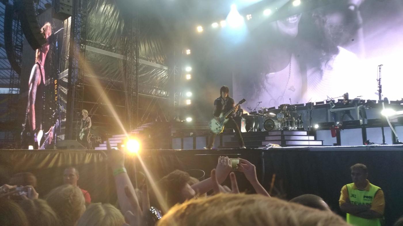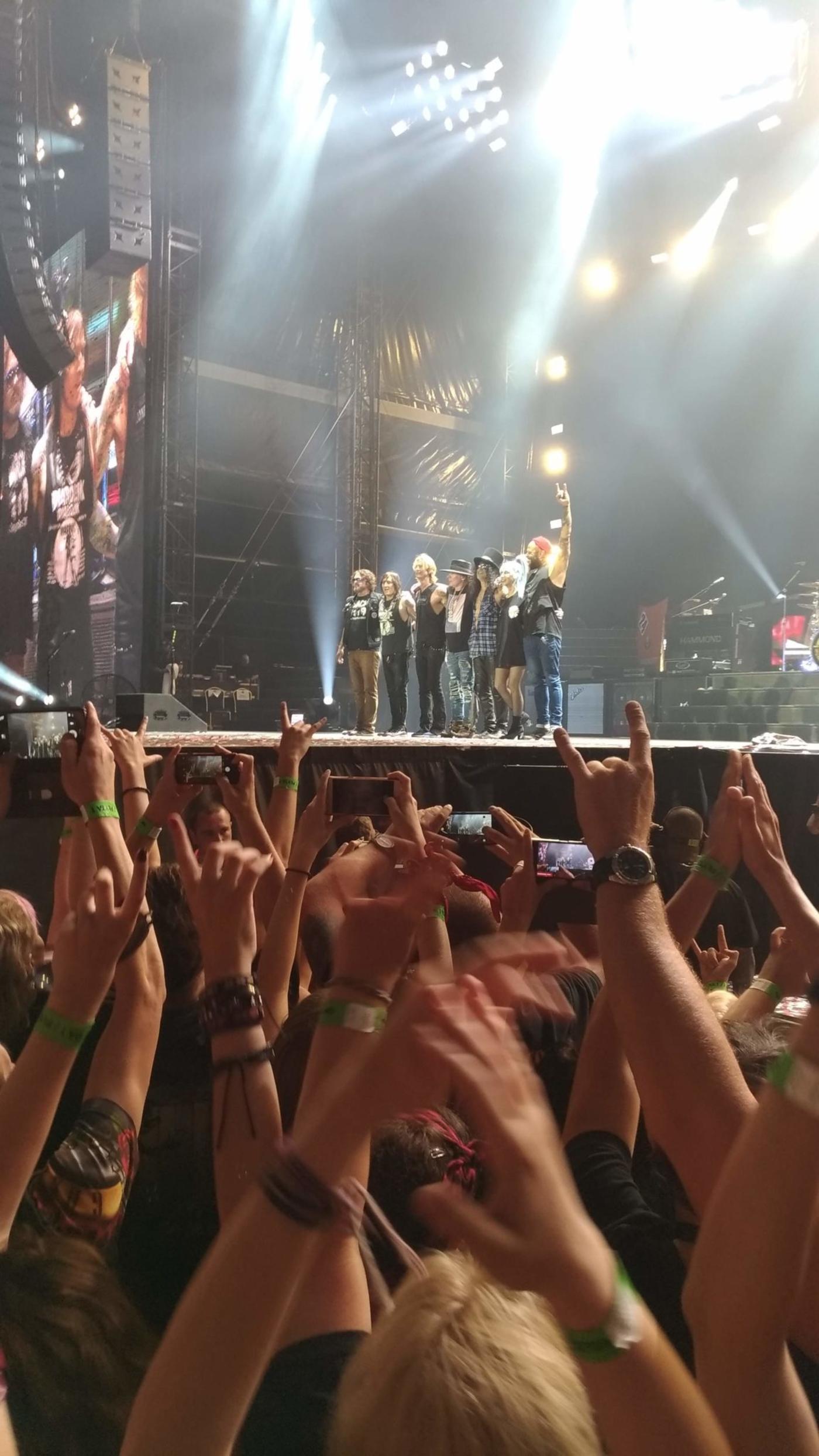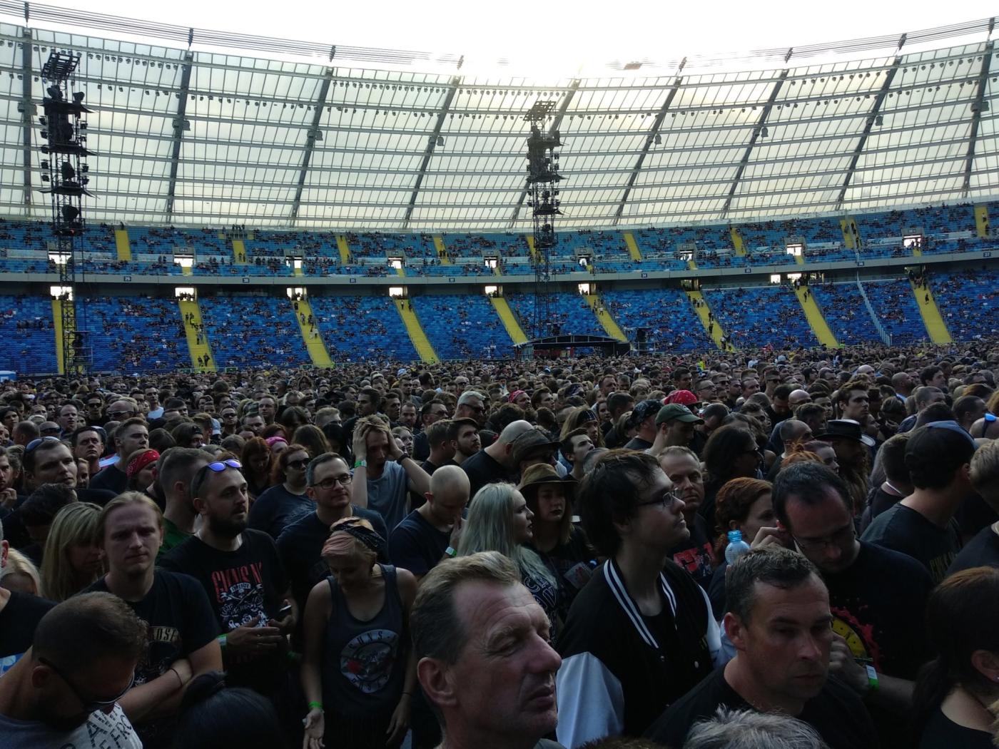 Mieliśmy bilety z możliwością wcześniejszego wejścia, więc trochę się zdziwiliśmy gdy zobaczyliśmy kolejkę ludzi, którzy też takie mieli. Po godzinie czekania w palącym słońcu otworzyli bramę. Sprawnie przedostaliśmy się pod ogromną scenę i zaczęło się 4-godzinne oczekiwanie na Gunsów. Pogoda nie ułatwiała sprawy. Słońce grzało niemiłosiernie a tłum z czasem coraz bardziej gęstniał.