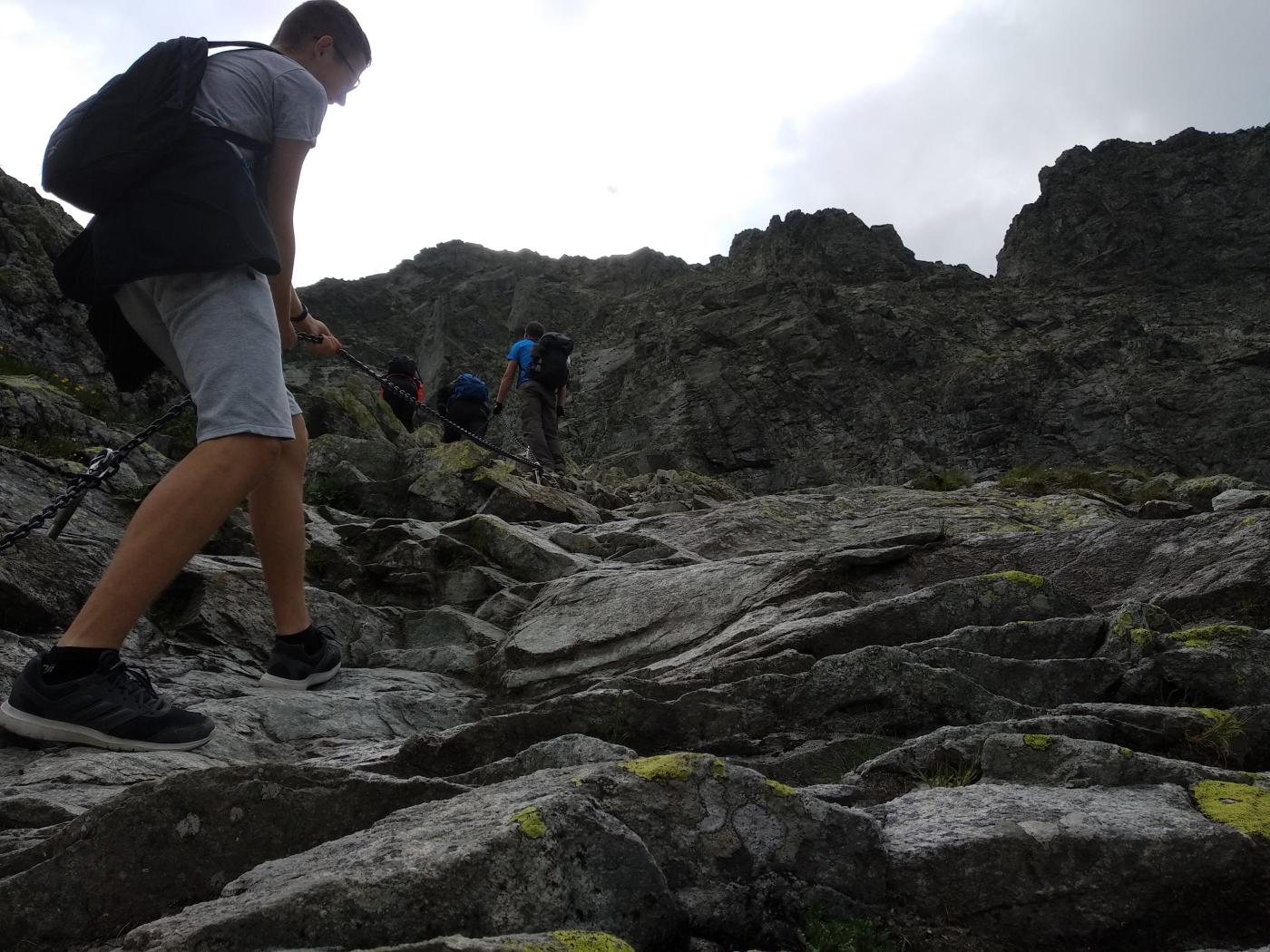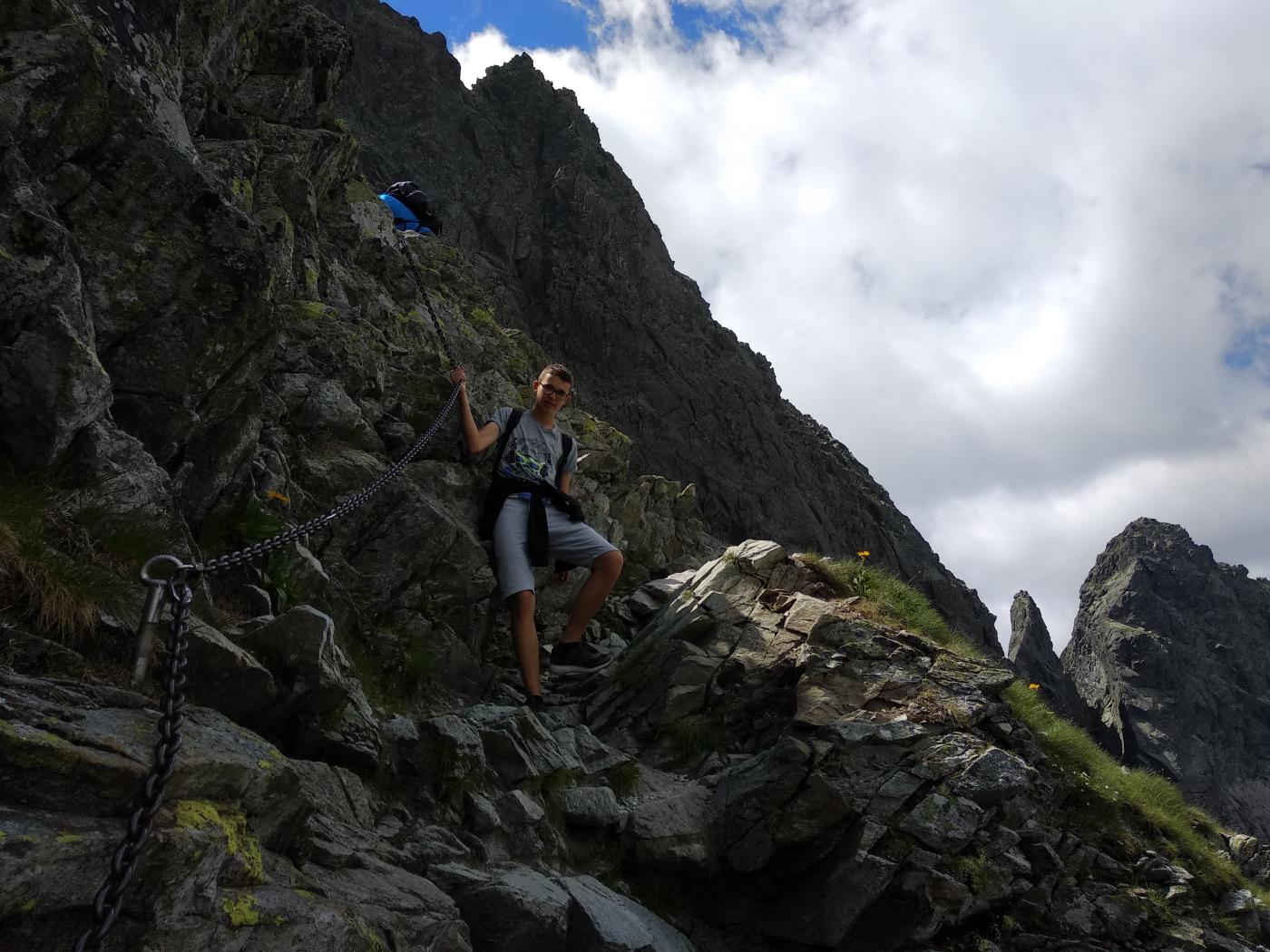 Mijają kolejne minuty i dochodzimy do Buli pod Rysami. Stamtąd zauważamy, że w dalszej części szlaku zaczyna się robić tłoczno. Mamy też świadomość ilu turystów minęliśmy po drodze, więc chcąc uniknąć kolejek nie czekamy dłużej i kierujemy się w stronę pierwszych łańcuchów. Kilka razy musieliśmy poczekać na swoją kolej, ale nie było tak źle. Kamil momentami miał już dość, ale wystarczała mu chwila oddechu i ruszał dalej.