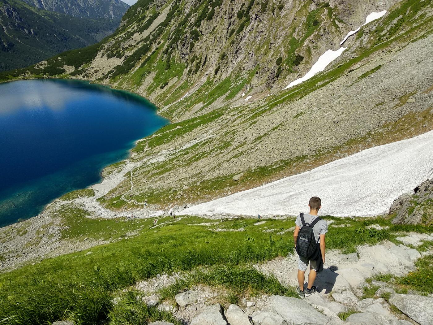 Idzie się nam bardzo dobrze. Wiedząc, że przed nami długa droga narzucamy sobie dosyć mocne tempo. Mijamy większość turystów i za niecałe półtorej godziny meldujemy się nad Morskim Okiem. Myślałem, że zrobimy sobie tu jakąś większą przerwę, ale po szybkim drugim śniadanku decydujemy z Kamilem, że nie ma na co czekać i ruszamy dalej. Po krótkim spacerku brzegiem jeziora dochodzimy do miejsca gdzie rozpoczyna się szlak na Rysy. Według niego do celu mamy jeszcze prawie 4 godziny. Humory dopisują, kondycja również dlatego też i Czarny Staw nie stanowił dla nas problemu. Dopiero po jego obejściu, zaczęła się cięższa część drogi. Szlak tutaj jest znacznie stromszy i biegnie po dość luźnych skałach. Za to z każdym kolejnym krokiem jesteśmy bliżej tych ogromnych gór, które za każdym razem wywierają na mnie niesamowite wrażenie i powodują uczucie zachwytu i podziwu dla tego małego kawałka naszego kraju.